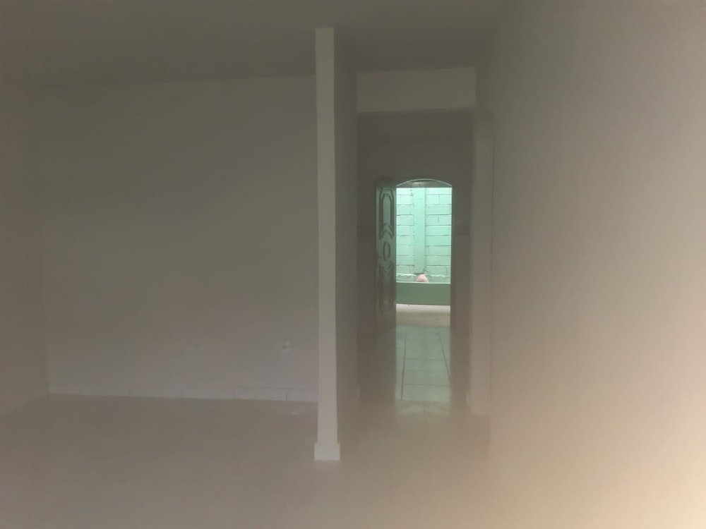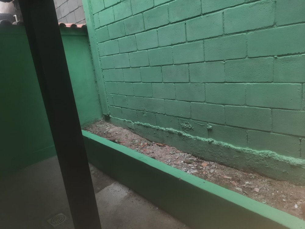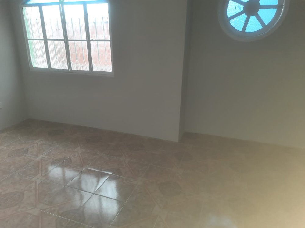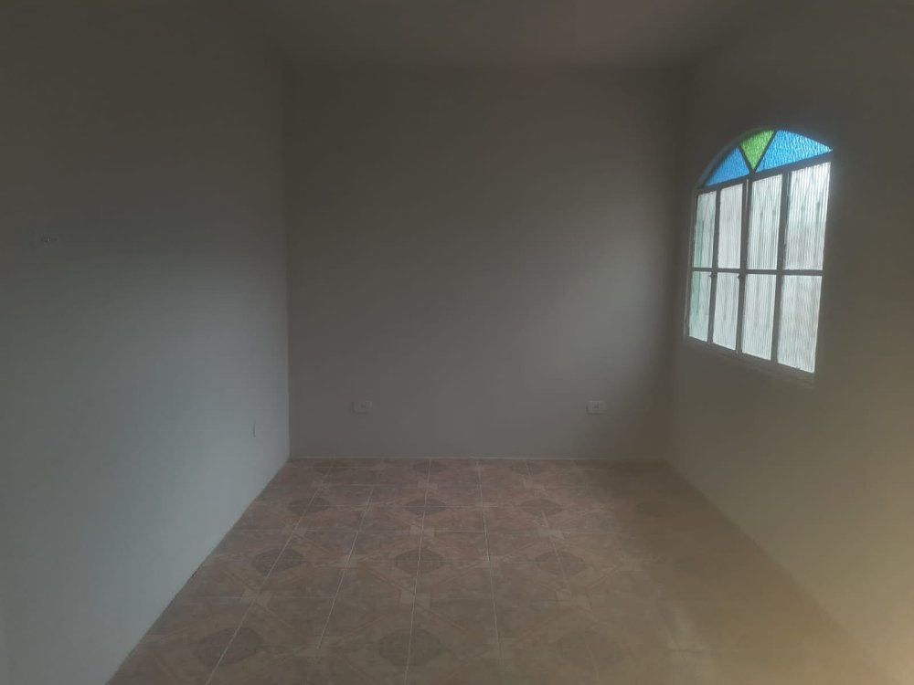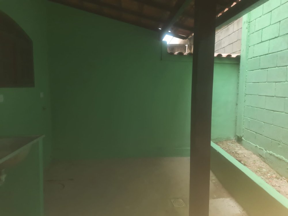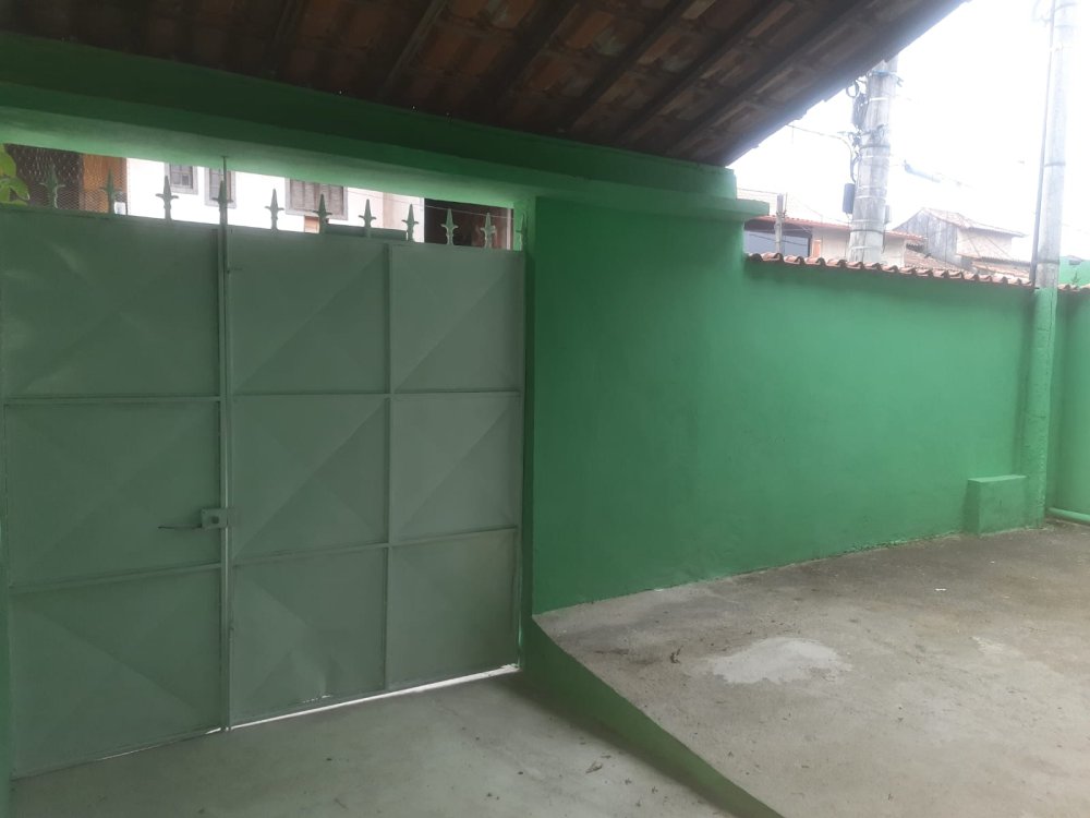 No andar térrero: sala, cozinha grande, banheiro, área de serviço, um quintal e varanda na frente, garagem coberta para um carro.