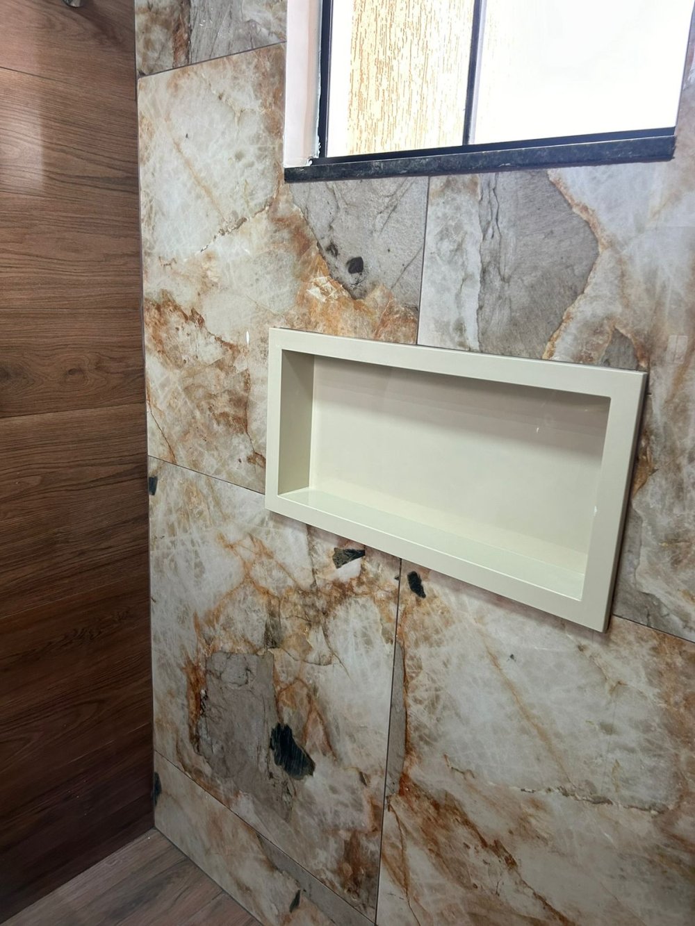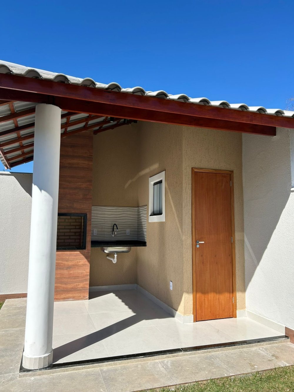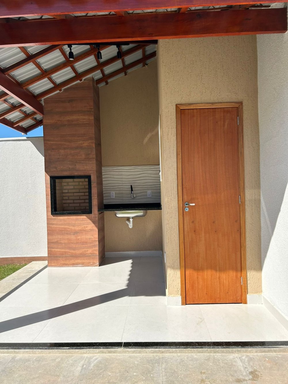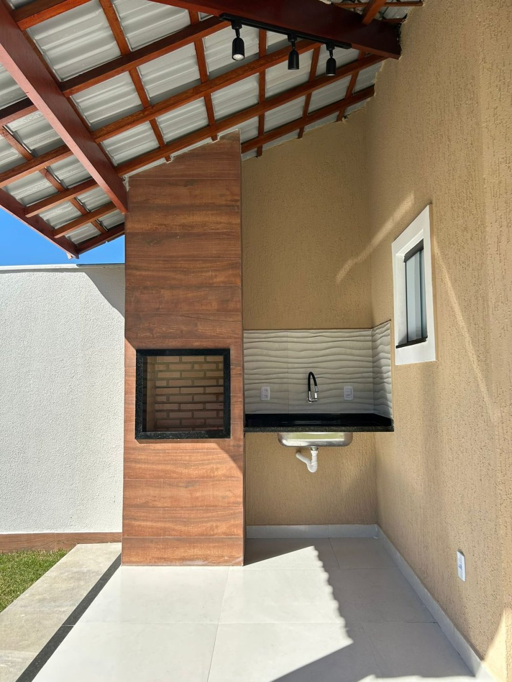 - área gourmet com churrasqueira revestida em porcelanato
